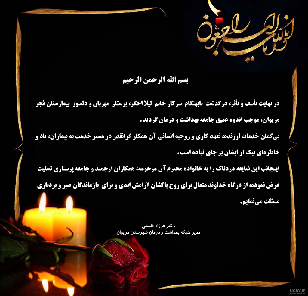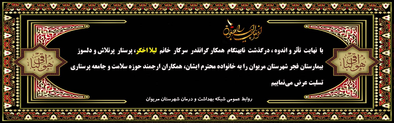 دکتر فرزاد فلسفی، مدیر شبکه بهداشت و درمان شهرستان مریوان، در پی درگذشت نابهنگام سرکار خانم لیلا اخگر، پرستار دلسوز و متعهد بیمارستان فجر، با صدور پیامی این ضایعه غمانگیز را به خانواده ایشان و جامعه سلامت شهرستان تسلیت گفت.