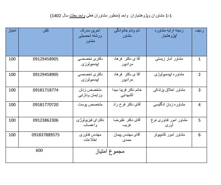 | 1 | مشاور آمار | آقای فرهاد مرادپور | دکترای تخصصی اپیدمیولوژی | 09129458905 |