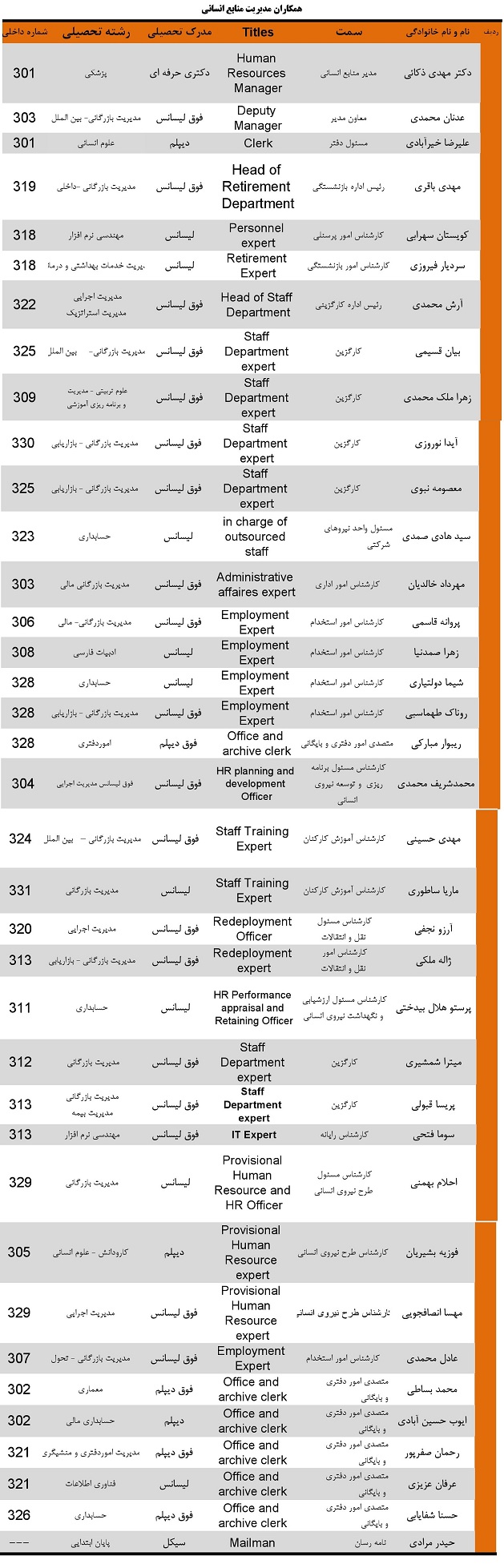 لیست همکاران شاغل در مدیریت منابع انسانی: